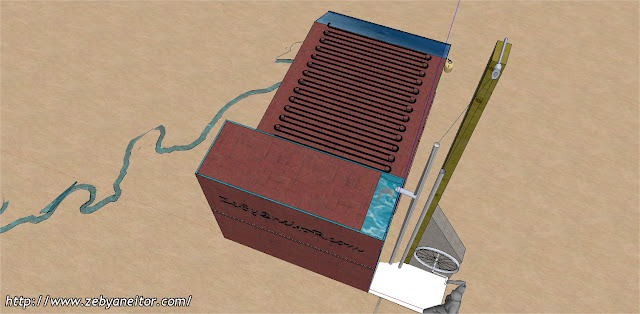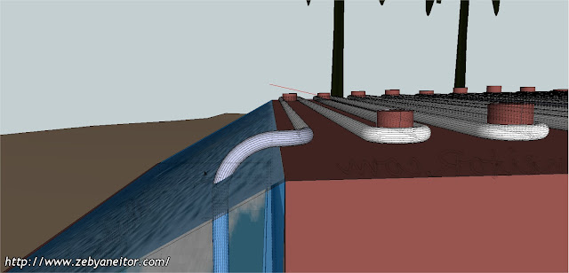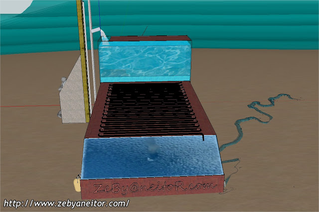 Este agua filtrada y salada pasa por una manguera (mirar diseño), que esta superpuesta en una plataforma muy poco inclinada, de forma que el agua, circula por esta manguera, con poquisima velocidad, consiguiendo absorber la máxima cantidad de radiación solar que se pueda.