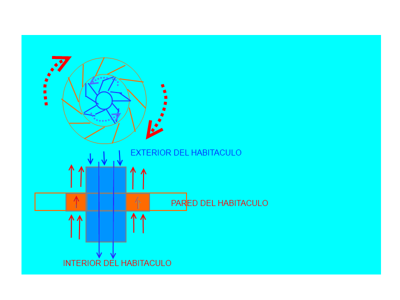 O no lo pillo o veo problemas. Por un aparte, el interior del ventilador centrÃfugo no es hueco, porque es en dicho espacio donde lleva el eje del disco giratorio... de hecho, en el dibujo de arriba se ve un circulito central y el nº 12 "disco giratorio". PodrÃa hacerse hueco usando el mismo sistema que las ruedas sin radios (http://latrola.net/blok/fotos-de-una-espectacular-moto-tunning-sin-radios), pero ese no es el problema. El principal impedimento que veo yo es que un ventilador centrÃfugo expulsa aire en perpendicular al eje... en el dibujo tuyo de abajo, las flechas naranja debes girarlas 90º, porque el aire fluye en perpendicular, no en lÃnea con el eje. Aún asÃ, sin sustituyes el ventilador centrÃfugo por uno de álabes (como el de la foto que has puesto) usando un eje hueco como la moto del enlace que te pongo, sà podrÃa crearse el efecto que buscas... pero en este caso se darÃa otro problema, y es que el ventilador central absorverÃa el aire que introduce el ventilador externo, creando un flujo de aire forzado que solo afectarÃa a las inmediaciones del ventilador... es decir, las gallinas que entran, por las que salen. Se podrÃa evitar este "flujo bucle" extendiendo el tubo al interior de la habitación, lo más lejos posible del dispositivo, con lo que ya nos topamos con casi un sistema de aire forzado convencional. En realidad, si pones un extractor en una esquina de la habitación y un simple agujero en la esquina opuesta, el aire entra y sale de una manera natural sin necesidad de instalaciones complicadas. O eso, o he entendido mal la idea. Si es asÃ, pido excusas. P.D. buen trabajo con el "buscaminas"