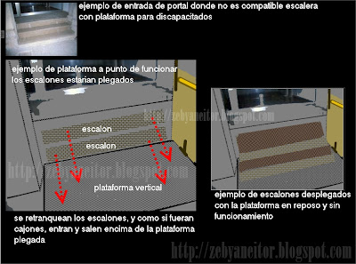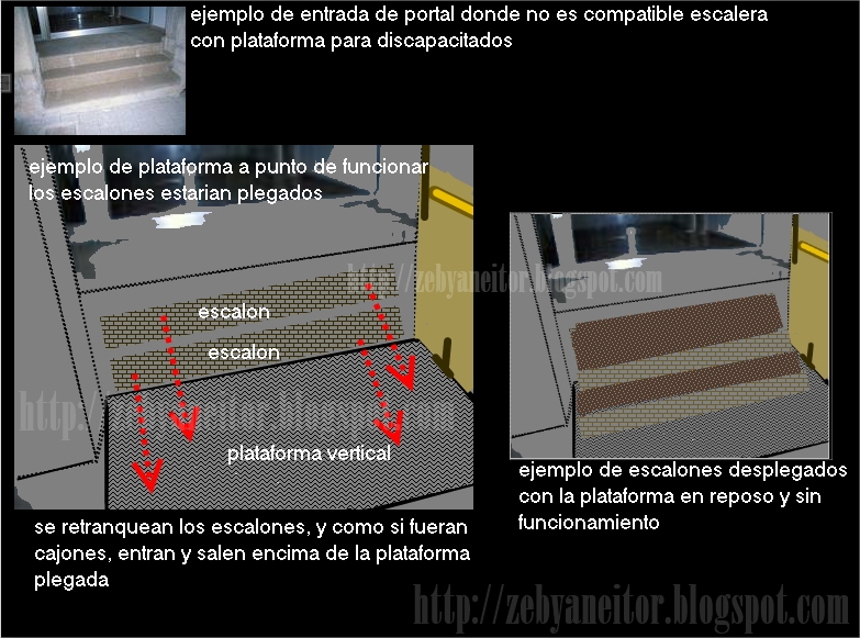 Apoyado en mi idea anterior, la de las escaleras encastradas en la pared http://zebyaneitor.blogspot.com/2010/11/escalera-encastrada-en-la-pared-de.html soluciono este problema, mirad el dibujo y os daréis cuenta que mientras la plataforma esta parada, los escalones están desplegados, cuando la plataforma tiene que ponerse ne movimiento, plegamos los escalones y podemos accionar el mecanismo de accesibilidad. Toda una solución para estas personas.