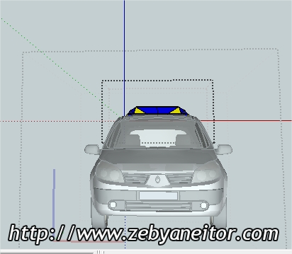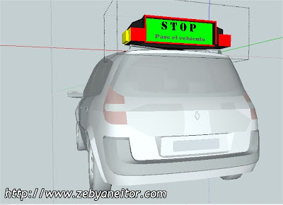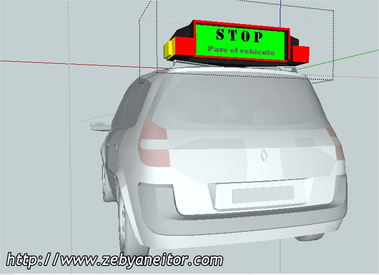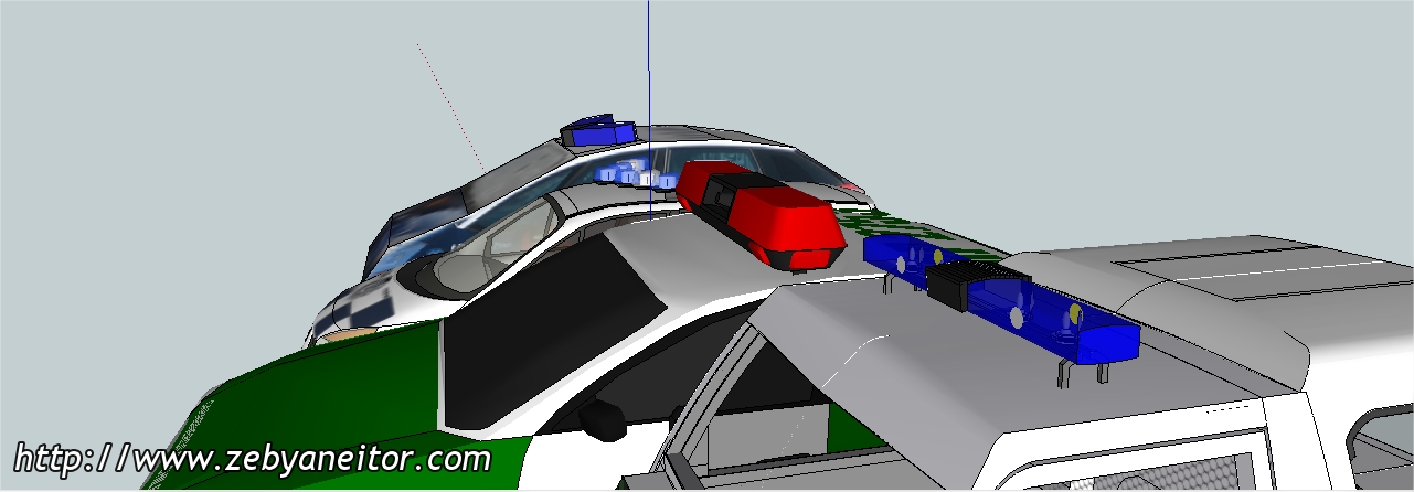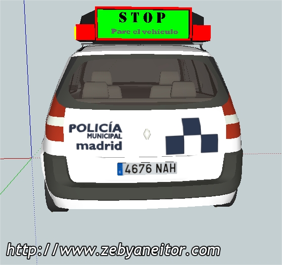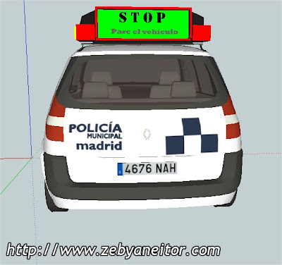 En principio, solapo el paquete de luces de techo con un alerón en forma de flecha, y ademas colocado en la zona de atrás del techo del vehículo. Incorporo una pantalla de"información y mando" para que se comunique con los vehículos que tengan a su espalda, esta pantalla podría incorporar cualquier grafismo o frase que el agente crea oportuno para la seguridad de la población.