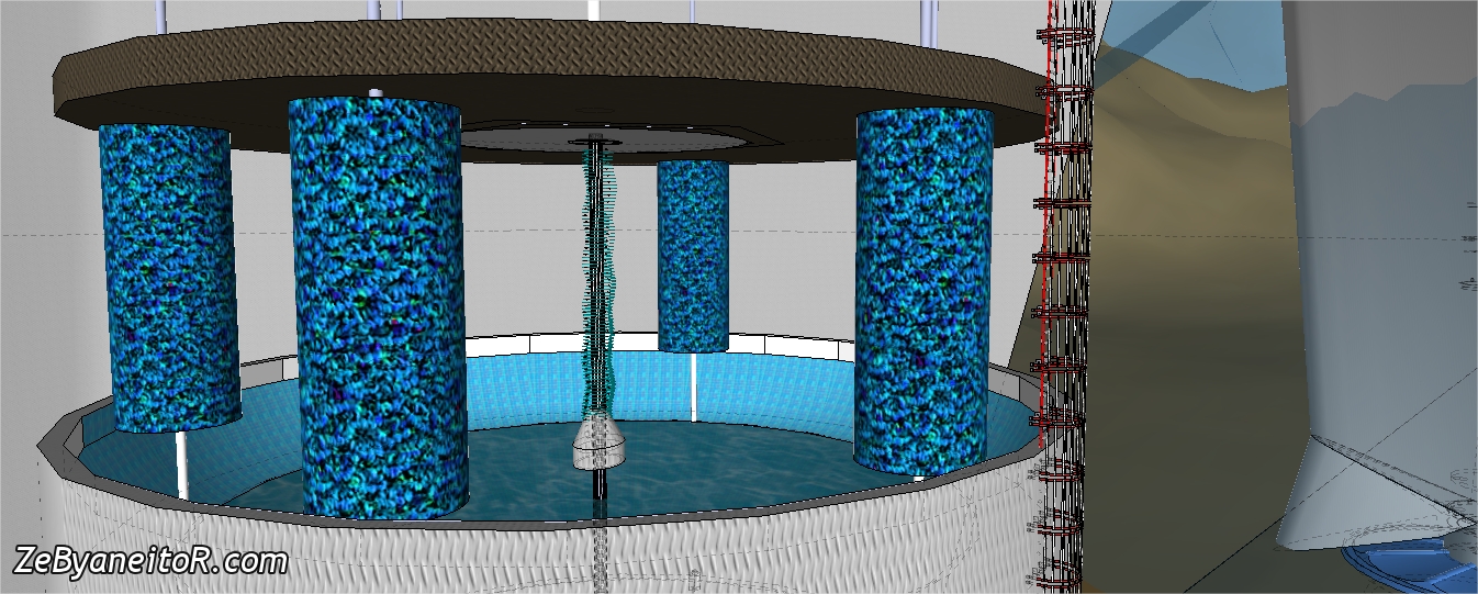 Aunando todos estos conceptos, llegamos a la Torre Hídrica, que es en si misma, una composición donde sumo lo dicho anteriormente, junto con el aprovechamiento de nuestra apreciada gravedad terráquea, para darle movimiento y autosuficiencia al sistema.