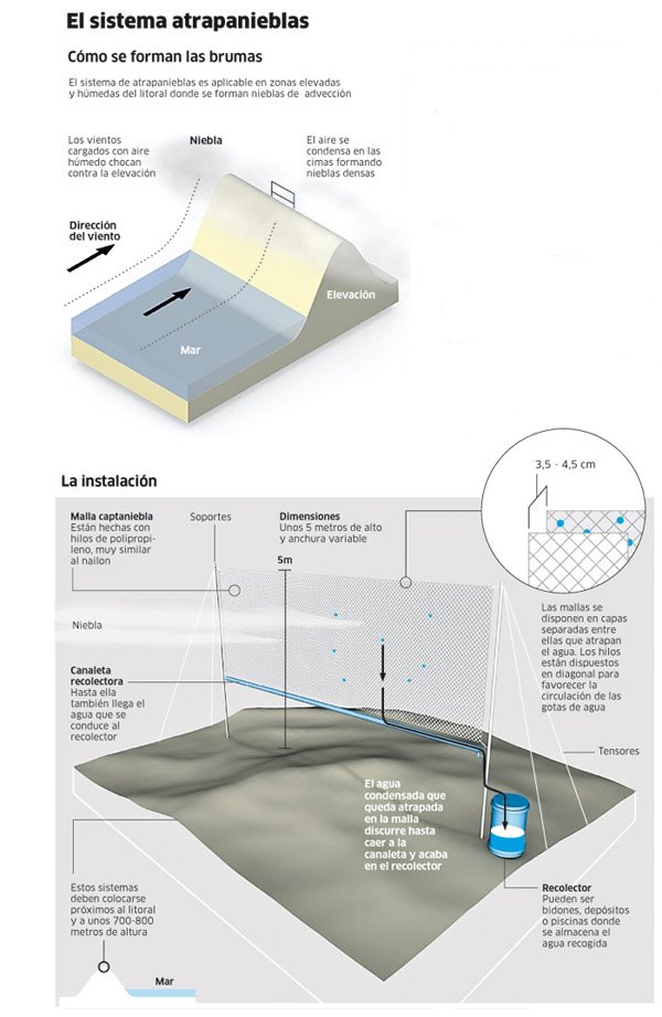 "Los atrapanieblas que se usan en los pueblos del norte chileno fueron desarrollados en conjunto con científicos israelíes. Están formados por un pedestal metálico en que hay un gran marco, de unos 6 m de largo por 4 m de alto. Este marco contiene una malla plástica que facilita la condensación de la neblina. En su parte inferior hay una canaleta y un estanque colector.