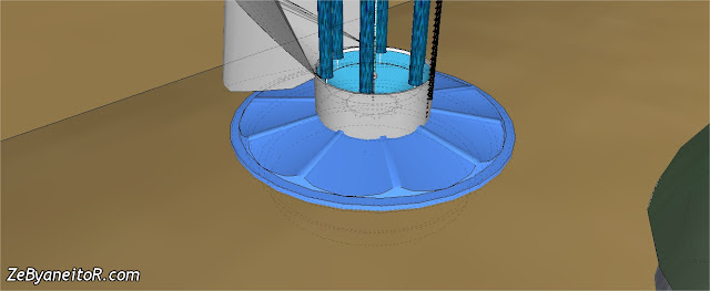 - Como observareis, las torres están "arropadas" por una especie de capa que no es otra cosa que un acumulador de niebla, para sacar el máximo provecho a la densidad que podríamos acaparar. Como esta niebla también se "pegaría" en esta "pseudo-capa", le he proporcionado una forma de embudo y metálica, para que vuelque hasta la mas minúscula gota de agua en el deposito inferior.