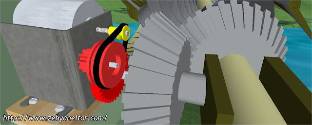 - Esta noria, esta proporcionando al mismo tiempo energía eléctrica, a través de engranajes apropiados, y de un motor que recoge el movimiento para transformar el giro del engranaje en electricidad.