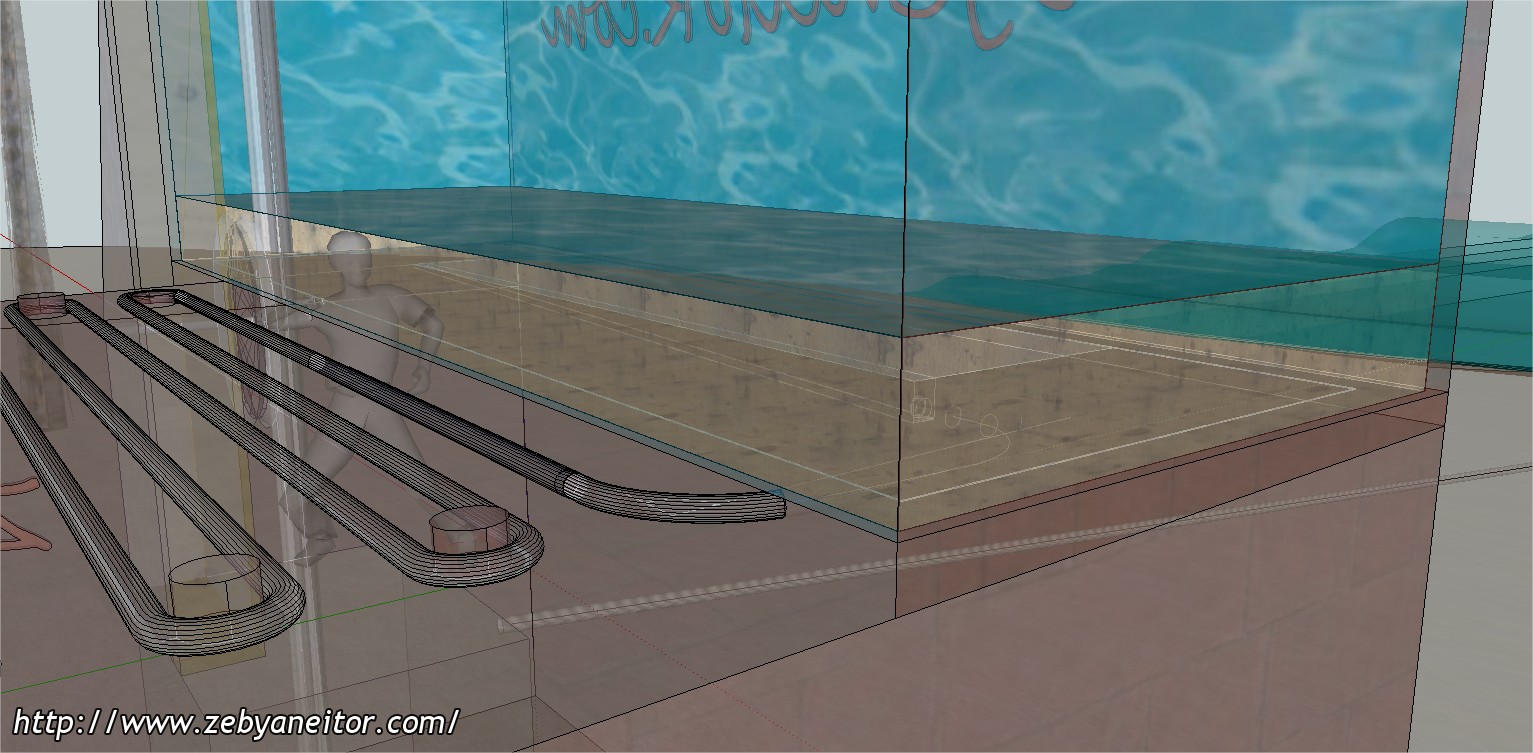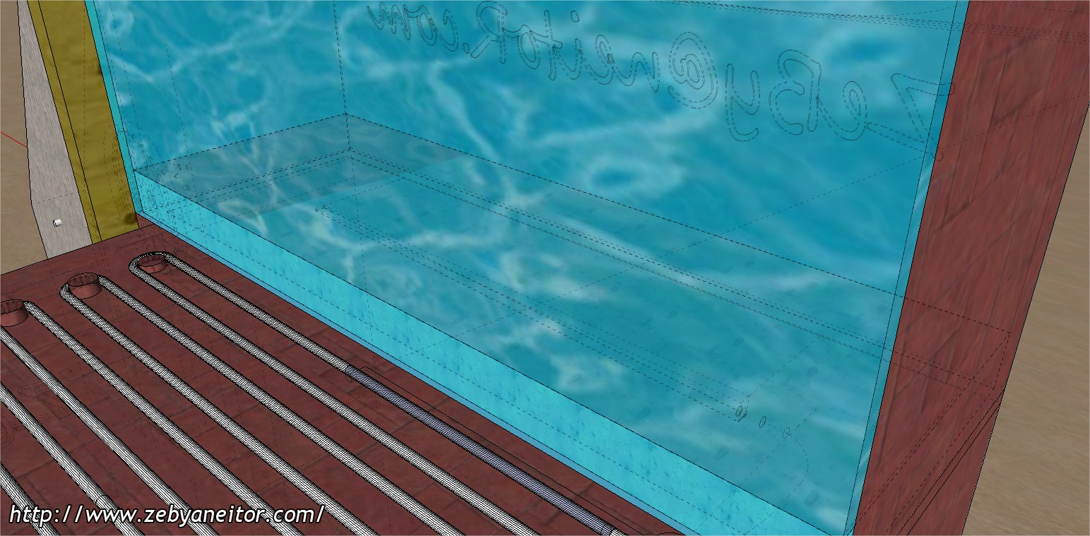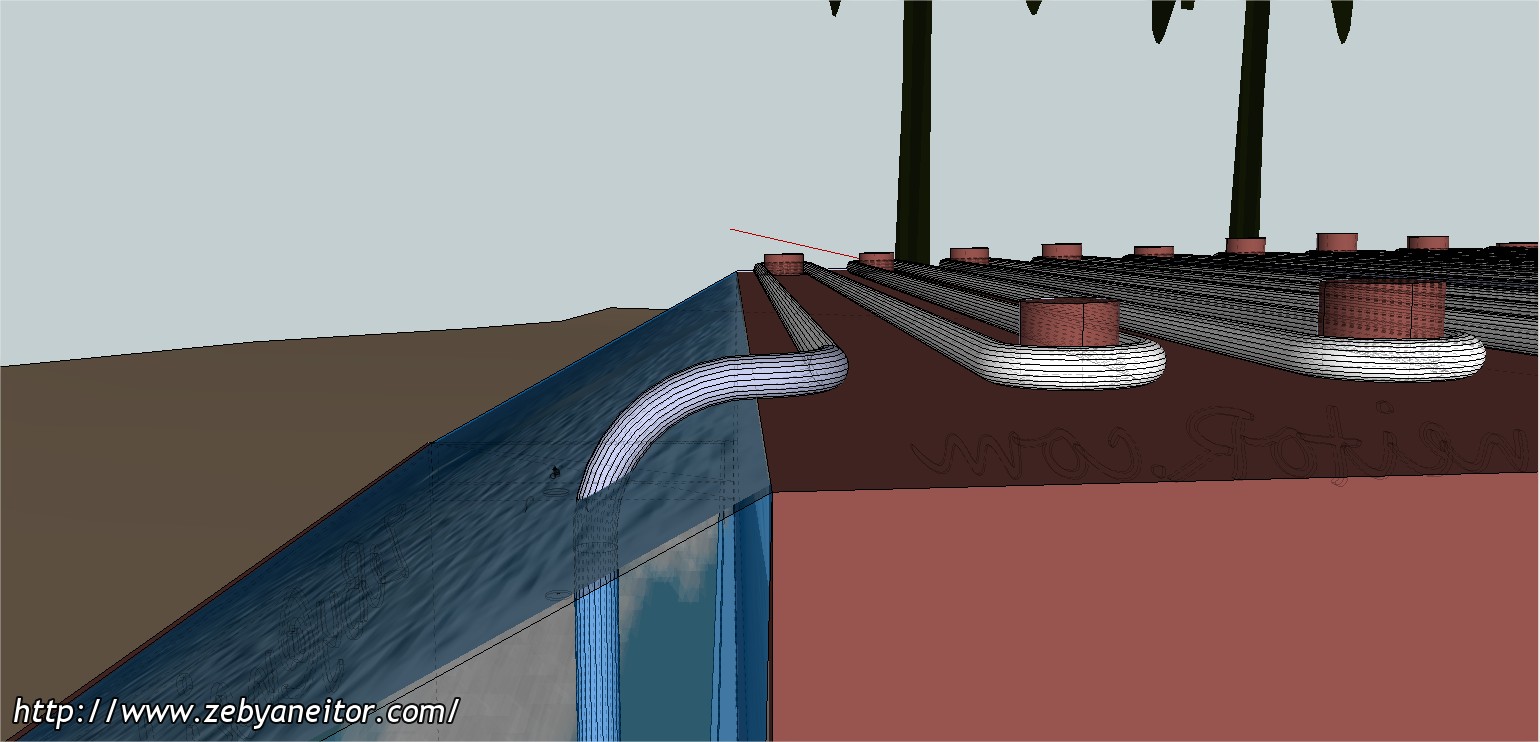 Este agua filtrada y salada pasa por una manguera (mirar diseño), que esta superpuesta en una plataforma muy poco inclinada, de forma que el agua, circula por esta manguera, con poquisima velocidad, consiguiendo absorber la máxima cantidad de radiación solar que se pueda.