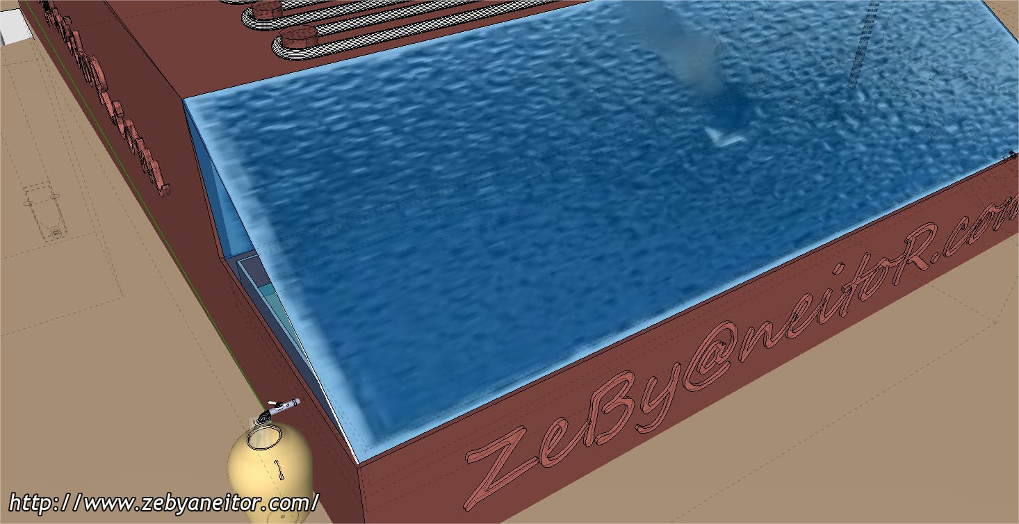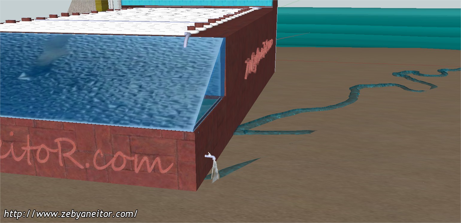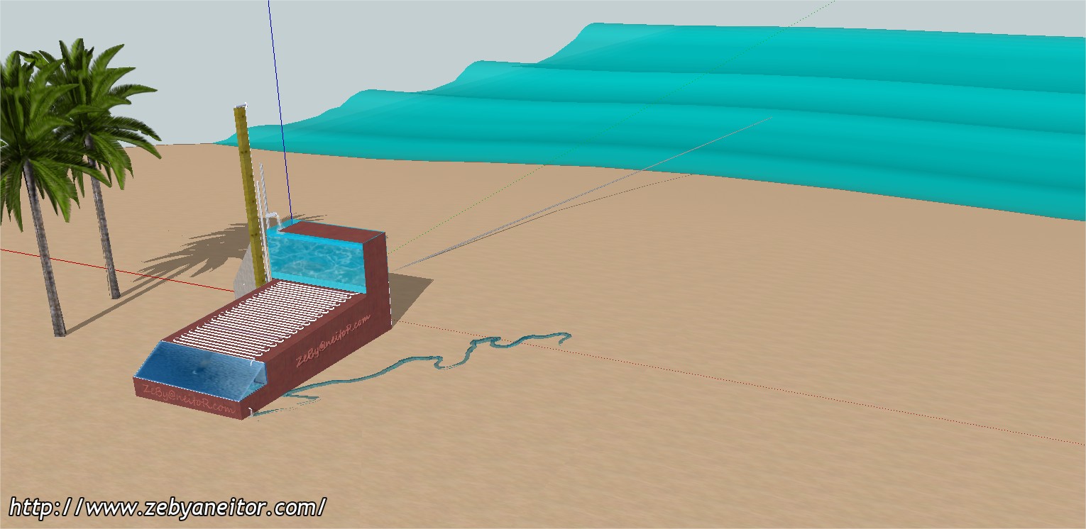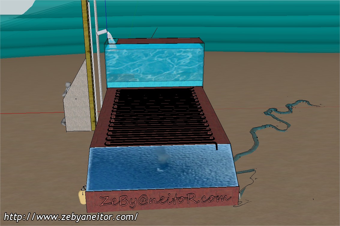 Con una bomba de agua de soga extraemos agua de el mar (la extracción la he efectuado en 90º, según el funcionamiento original, no creo que haya ningún problema en este tipo de cambio), esta agua salada la introducimos en un deposito que tiene debajo una abertura pequeña, en el centro.