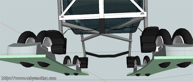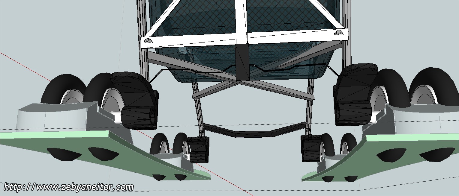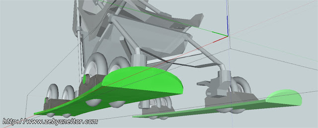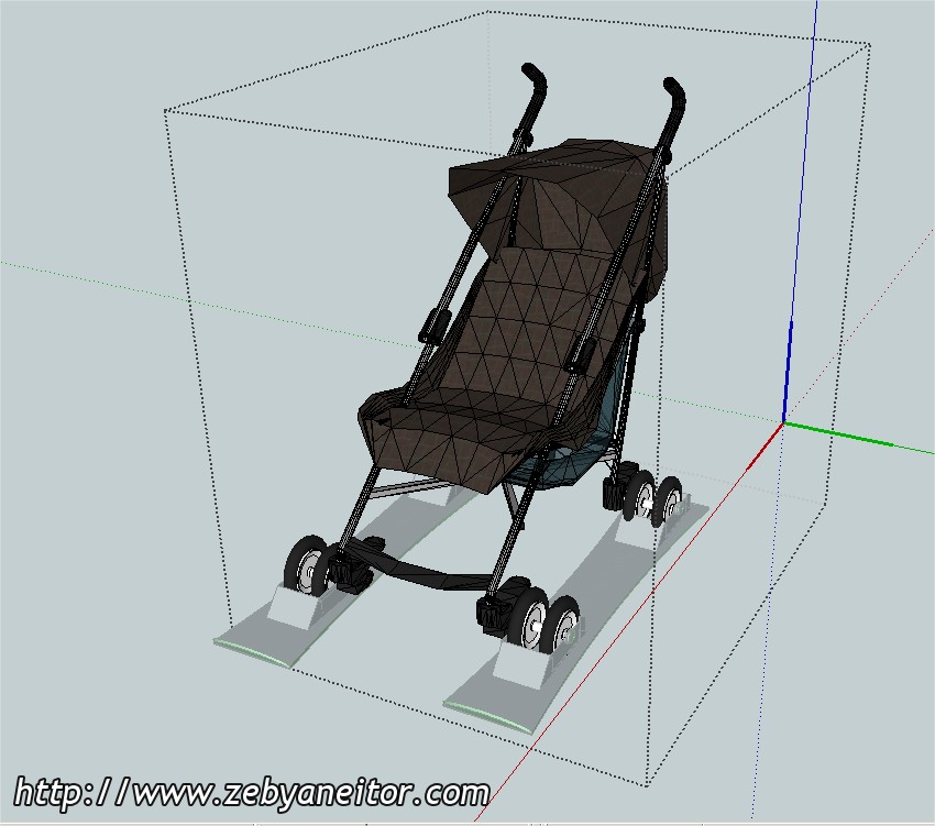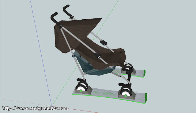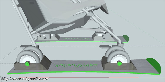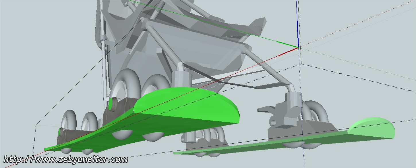 El diseño es muy simple, simplemente colocando dos esquíes encastrados en las ruedas del carrito, pero con la salvedad de que las ruedas puedan rodar en circunstancias, donde no tenga que "navegar" con los esquíes, observando el dibujo comprenderéis a lo que me refiero.